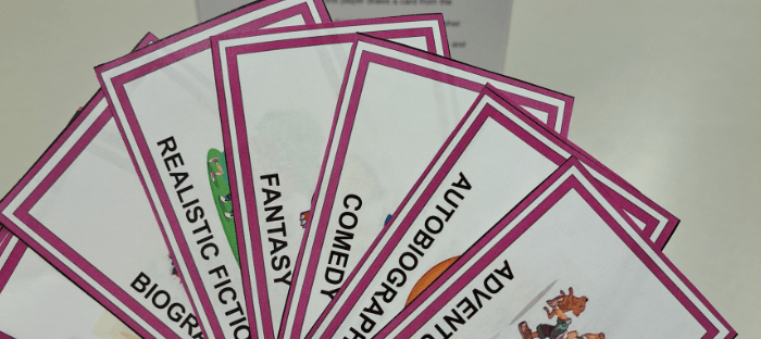 - First player will ask one other player if they have a book genre card to match one of theirs. (Do you have Nonfiction with a snake?)